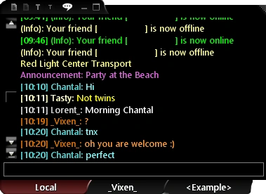 This feature communicates with another user privately. VIPs can open a new Chat tab to another User by right-clicking either their avatar or their name in the Local tab of either the Chat or Friends List panel and then selecting