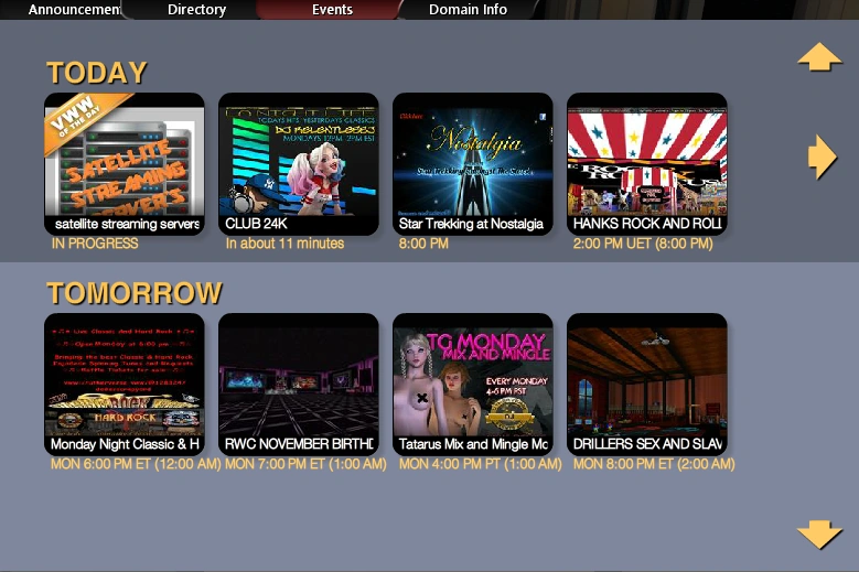 There are two events listings, the Utherverse Events Calendar web page and the in-world Explore button on the User Interface in the Events pop-up panel (aka Directory).