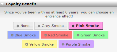 The loyalty benefit, also known as the poof cloud, is granted to accounts who have been a member six years or more. You can change the color of this poof or even disable this. This poof cloud is displayed in-world to others when you port to a location or exit your in-game closet.