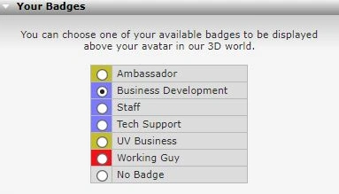 This displays the badges you own. Generally you only see the "no badge" option enabled. If you have additional badges they are listed here, Select which badge you want to display to others as text underneath your name in-world. Your badge is also shown in Local chat, any Search results and on the Friends list of your friends.